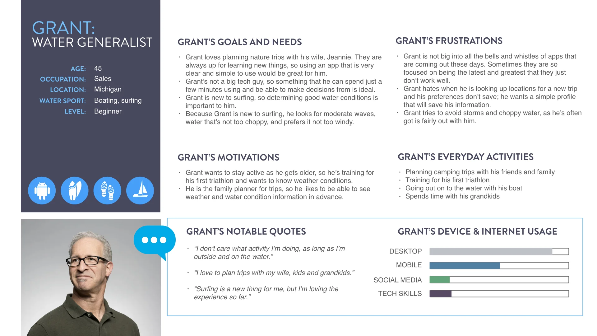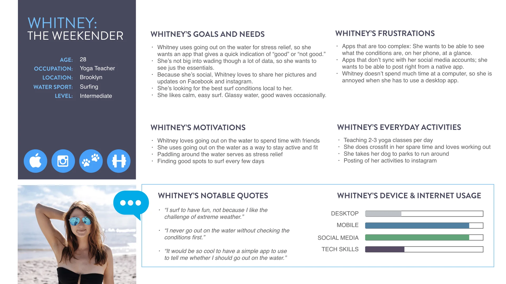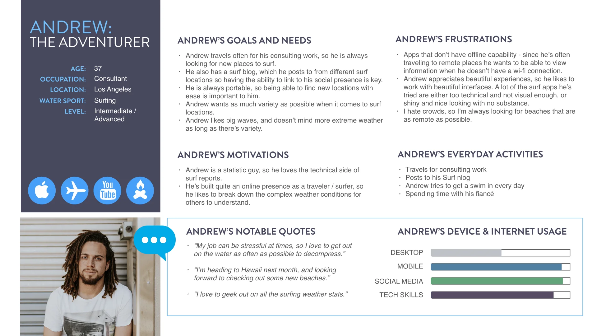 I created a script and thirteen questions with the focus on discovering a user's motivation and behavior when using surf weather apps. I interviewed people within the following demographic in order to better understand the needs and behaviors of surfers: