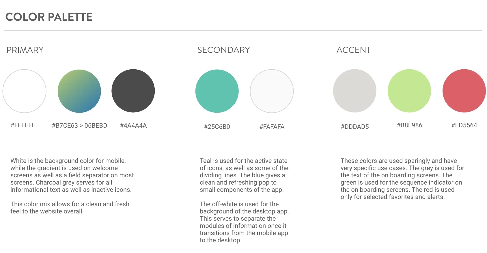 I created both a style guide and a design language system in order to ensure consistent use of all of the apps elements. These both helped in providing context and assuring that there is consistency across platforms and devices. I then referred to Google's Material Design System to make sure that my design and interactions adhered to these guidelines since I was developing a native app.